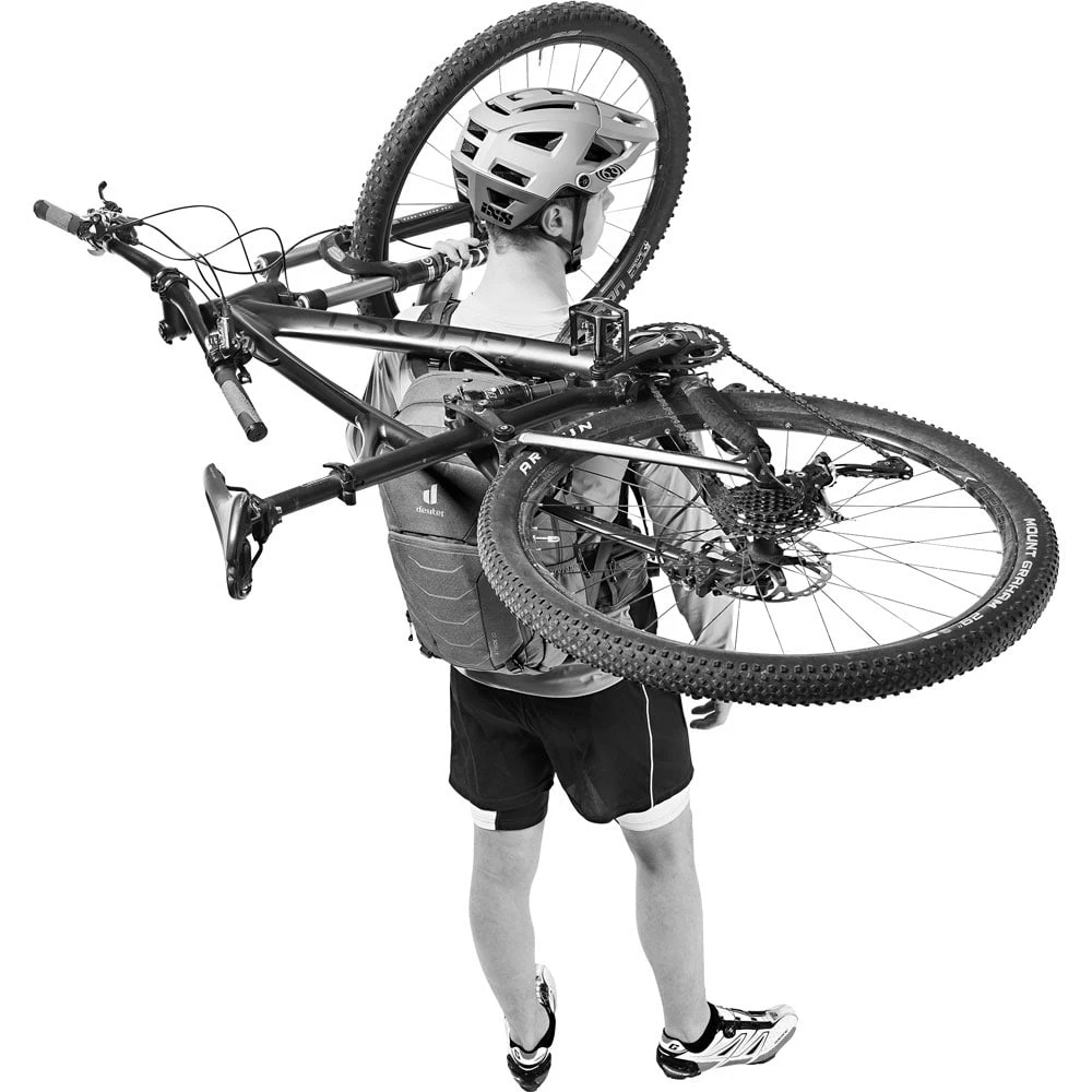- Carrying Guard: spezielles Material oben am Rucksack und an den Schulterträgern zum sicheren Tragen des Fahrrads auf dem RĂĽcken/Rucksack – abriebfest und rutschfest
